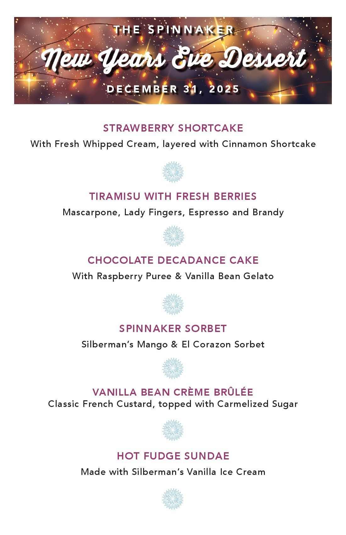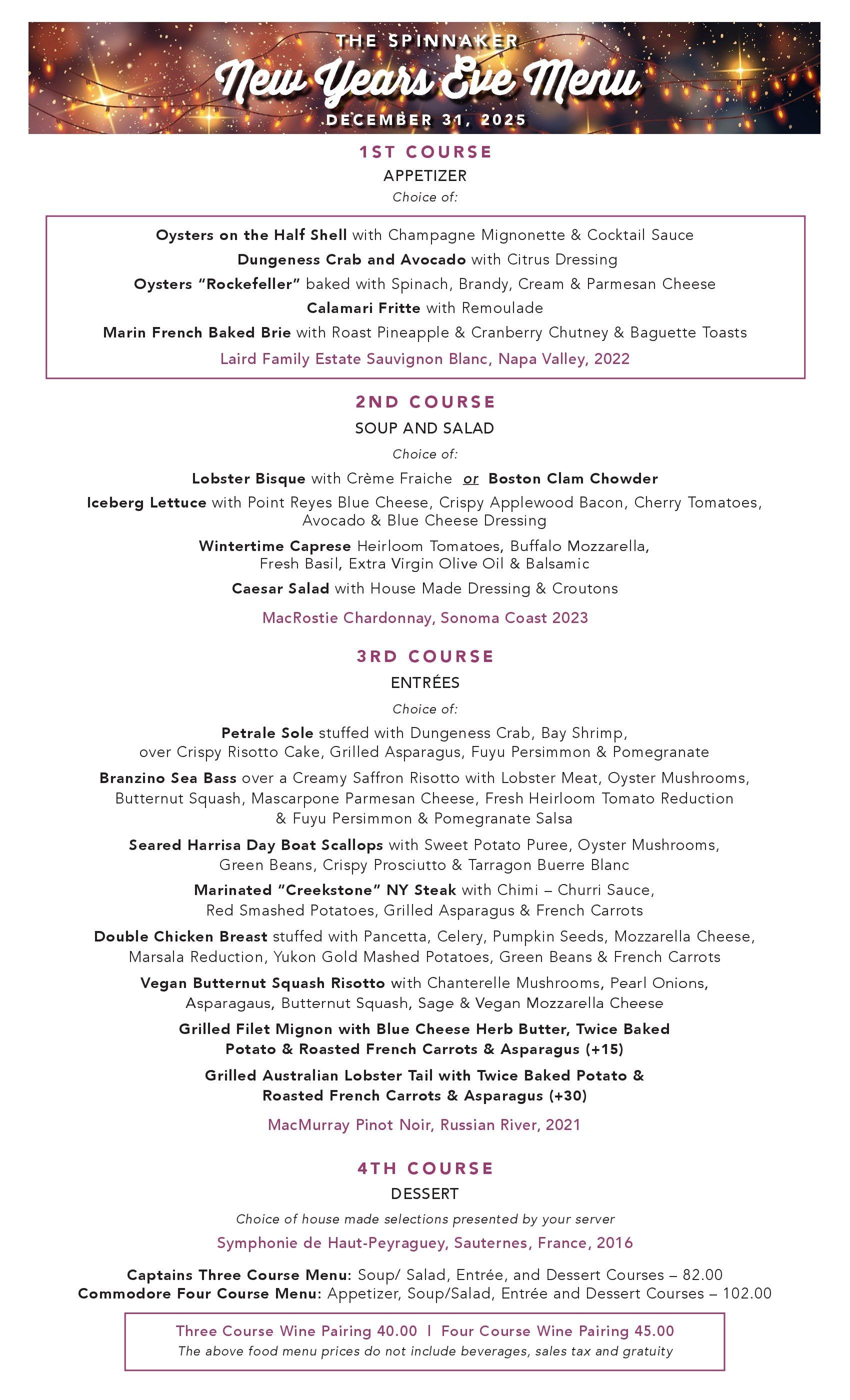 New Years Eve Dinner and Dessert Menu