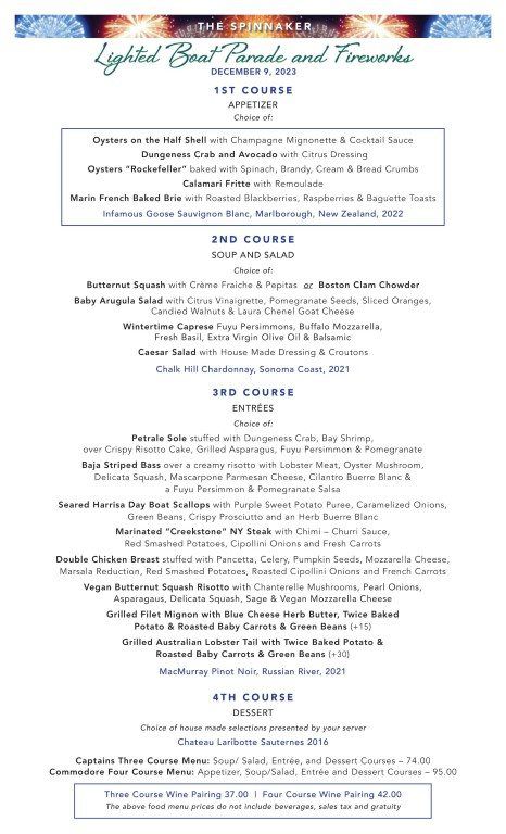 Sausalito Lighted Boat Parade Dinner and Dessert Menu